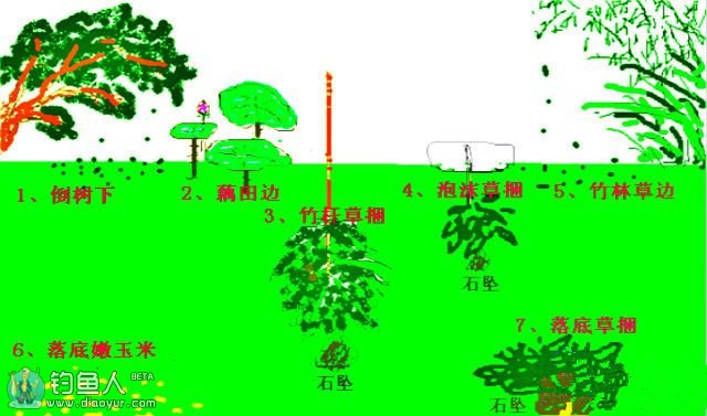 根据草魚的食性,钓草鱼宜选倒树,草丛、竹林茂盛的地方,因那里常有落叶、落果(如枸树果,桑椹果等)、落虫(如蚂蚱)等,尤其是赊水后,岸边无草时,这些地方多是饥饿草鱼常来之地。