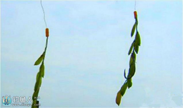 若主攻草魚,可一钩挂草、一钩挂嫩玉米粒或发芽包谷米。由于发芽包谷籽胚胎木了,从中间穿,易成两辨,那就横穿,挂草可象缝衣服那样,用钩穿线2、3“针”后,再钩挂草丫或叶茎,(如上图)。