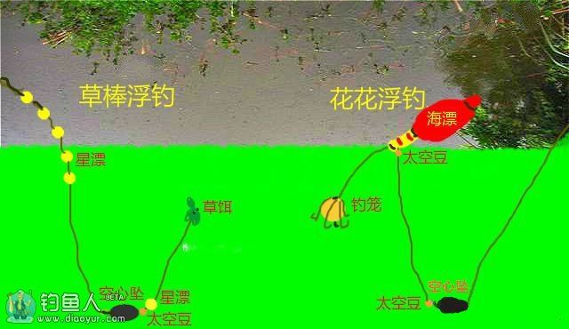 有的草饵丶虫饵具有浮力(如枸树尖丶蚂蚱等),在草棒钓组钩上方穿一星漂,主要用于调整草饵的浮力用。钓草饵,坠宜用大些(如10克),便于抛饵。如:栒树尖本身就有浮力,把星漂捋到坠边就行;若挂其它菜叶、嫩玉米粒等,需要浮力时,将星漂朝钩柄捋就可以了。