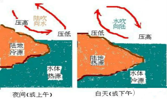 气流由高压流向低压,即形成陆地吹向水体的风;随着阳光的照射,白天陆地升温更快,到下午2、3点钟,陆地形成热源,水体形成冷源,从而产生由水体吹向陆地的风。