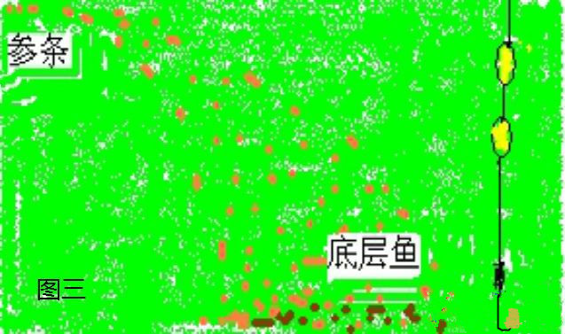 当起风浪时,调整铅坠,使星漂水面三粒(好借风使浪),水下二粒,坠悬浮,钓轻触底(见图一)。
