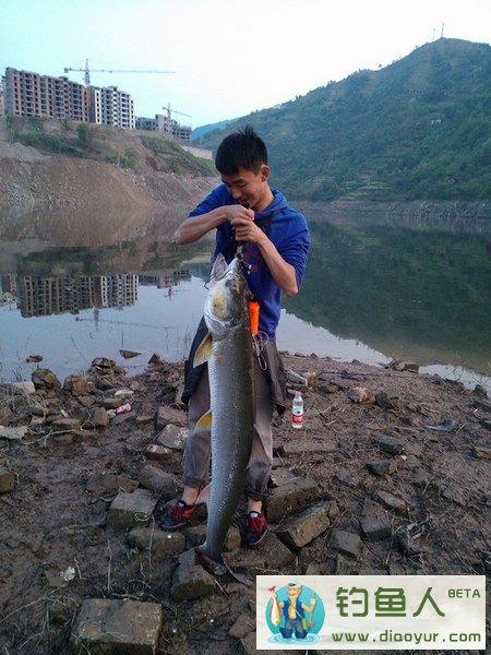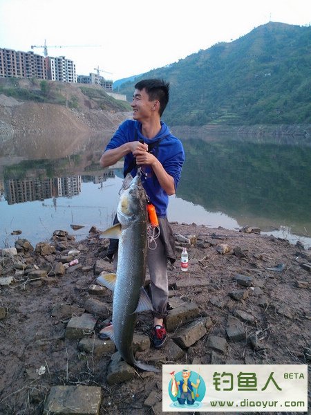 2013年4月3日,天气晴朗,依计划我和老表以及好友一行4人驱车前往80公里以外的长江支流老钓点路亚,经过90分钟的车程我们于下午5点左右到达钓点,当时已经有两位钓友在钓位路亚了,所以我们决定两人先去吃饭打包回来,我和本文主角(我老表小唐)先到钓点占位置,观察一下,长江水位比前几天下降了了1米左右,好的钓位已被占据,只有重新选定位置。观察了一下,离我们面前4米左右的地方由于水位下降突出了一块10平方米左右的土坝,老表当机立断说要去土坝上,看了一下岸边和土坝之间的水下环境,水深1米左右,水下有几块大条石,脱掉裤子勉强能过河,老表已经迫不及待的过河了。