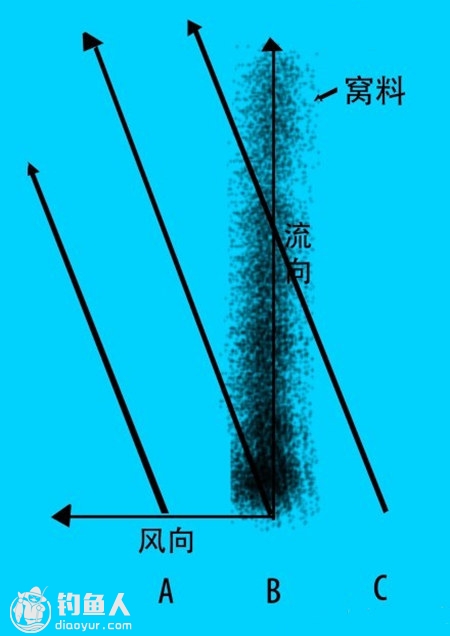 钓饵行程与窝料行程如上图所示。由此可知,在A点下竿,钓饵行程偏离窝料行程。在B点下竿,钓饵从窝料最初覆盖区域出发,行走一段距离之后,离开窝料覆盖区域,进入空白区。而在C点下竿,钓饵漂流一段短距离之后进入窝料覆盖区域。