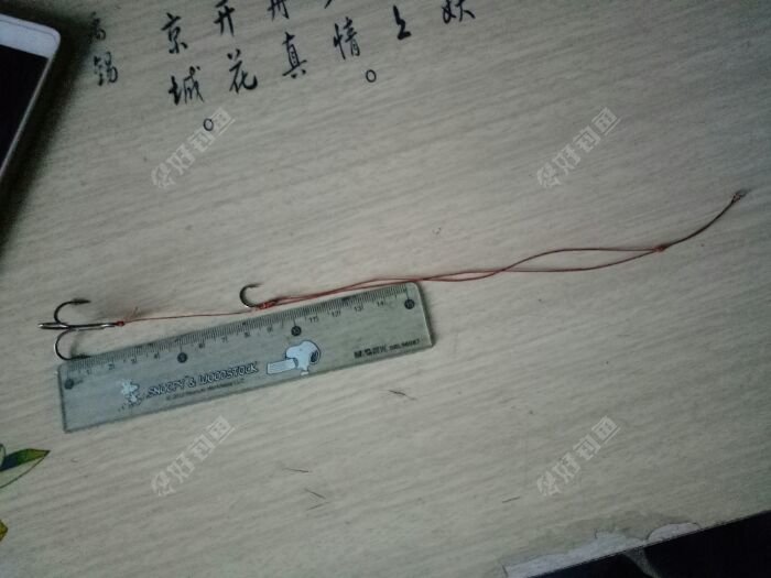 三本钩在下,伊势尼钩在上,然后钩距留六到十里米对折打节。正好八里米。
