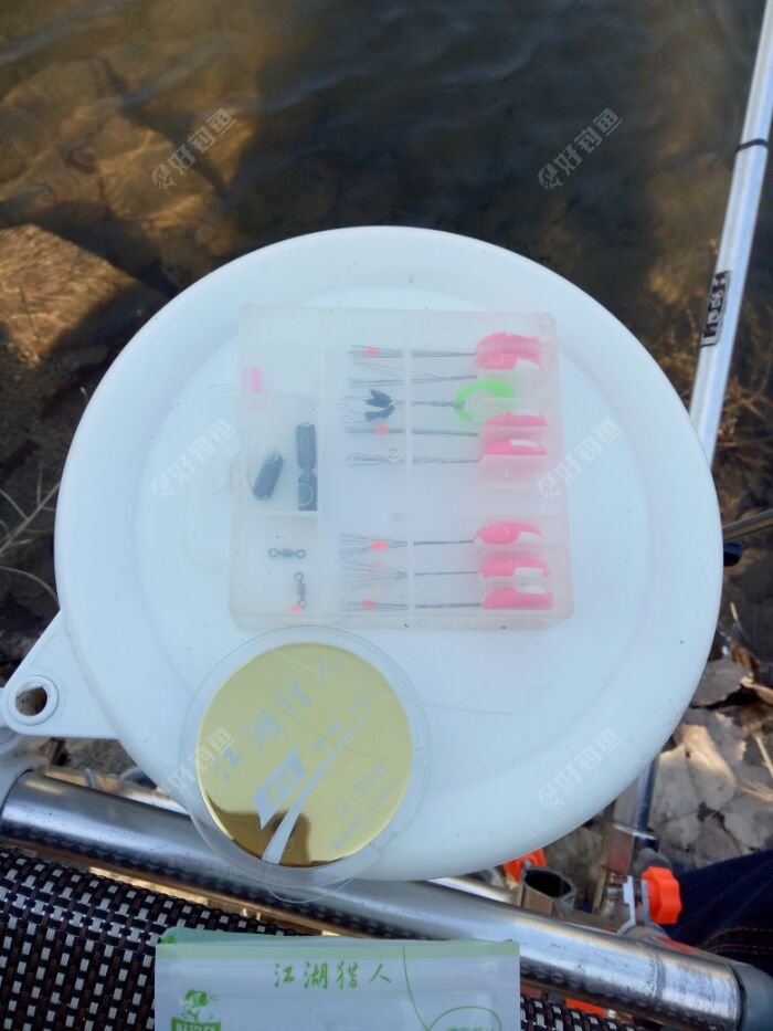 轻车熟路,摆开阵势做钓。天冷钓远用五米四手杆钓,线组要小2.0+0.8钩子也要轻。坏了,主线都是大线,没有细线这可怎么办。还好车上还有一盘二点零的子线。只好用江湖猎人2.0子线现场绑一套了。 酒米打窝,绑好再钓也不迟。