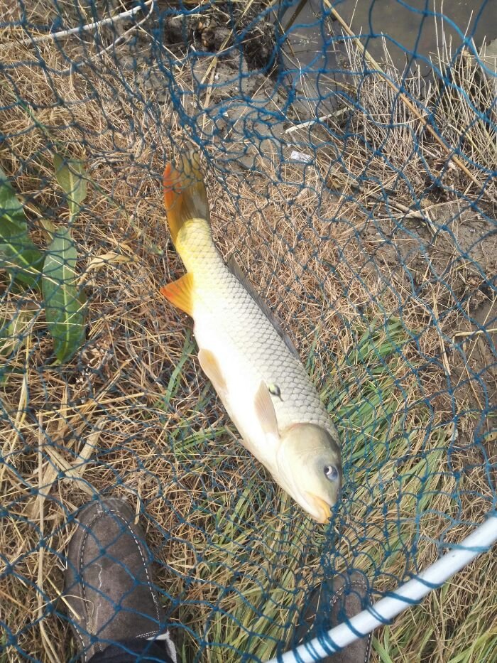 抄鱼上岸,必须拍照留念,今年收获最大的大鲤一枚,估计5斤左右。