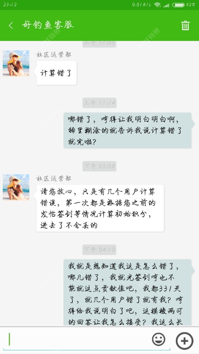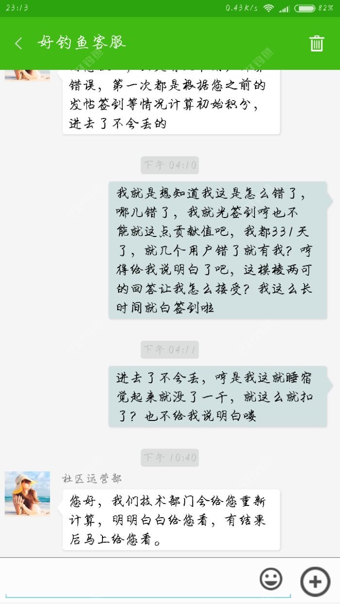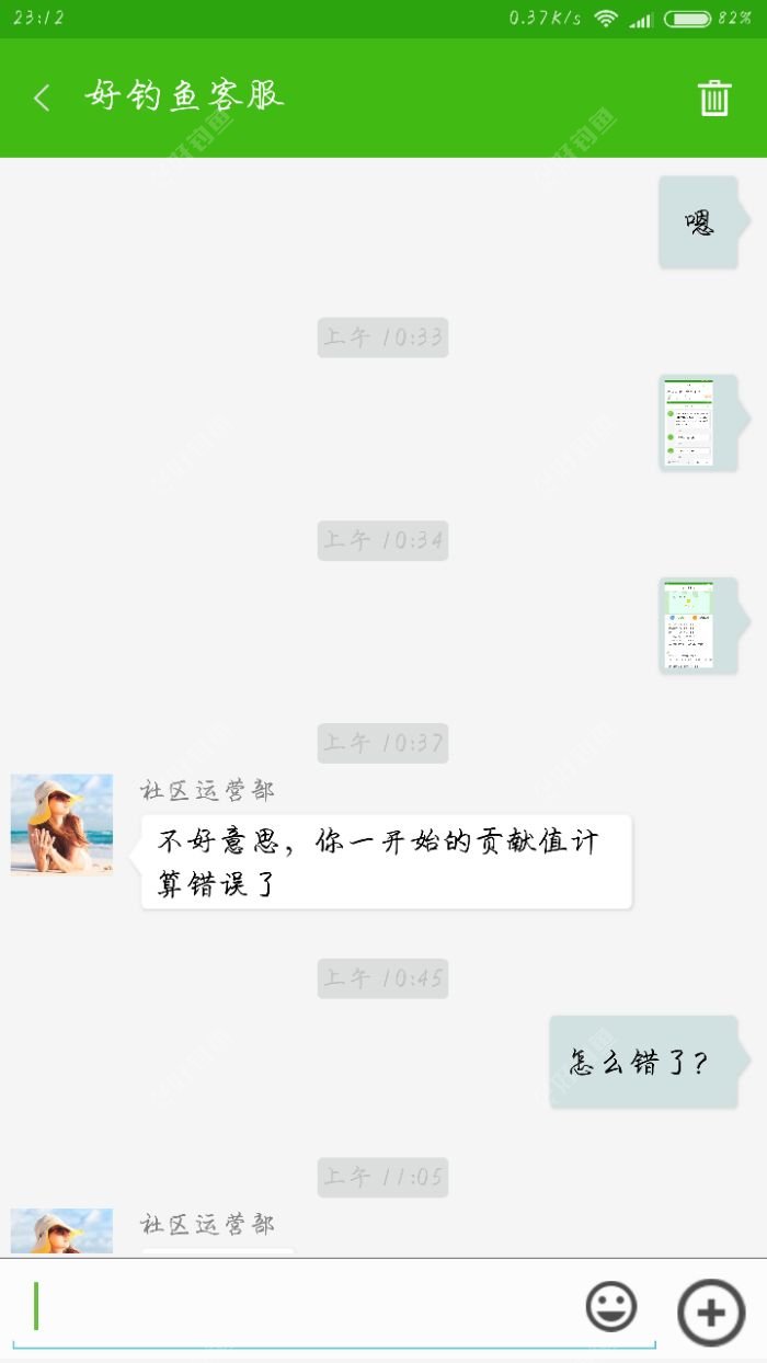 [i=s] 本帖最后由 kscs0683323 于 2017-12-30 23:33 编辑 [/i] 昨天晚上我的贡献值是1766,睡宿觉起来就给我扣了1000,系统推送的信息都给删了,联系客服,告我说算错了,一句算错了就扣了我一千,我都想把软件卸载了,太操蛋了,我都签到331天了,嘛呀,签到快满了就给我弄这个,大家看看第一张截图,本身就给我少算着呢,140+4626=4626,我再笨也知道这个少140啊,这我就没说什么,还多给我扣一千,这心里太憋屈,吭哧瘪肚的整天签到回帖的,给我来这么一下子,太扯淡了!刚开始用钓鱼人,后来出问题卸载重装,看见好钓鱼了,下载下来一看,觉得比钓鱼人好,就不再用钓鱼人,每天就是在好钓鱼上签到,这现在自己没法钓鱼了,觉得每天在平台上看看其他钓友的帖子也挺好,本来觉得这平台挺好的,这一下弄得我都有点寒心了