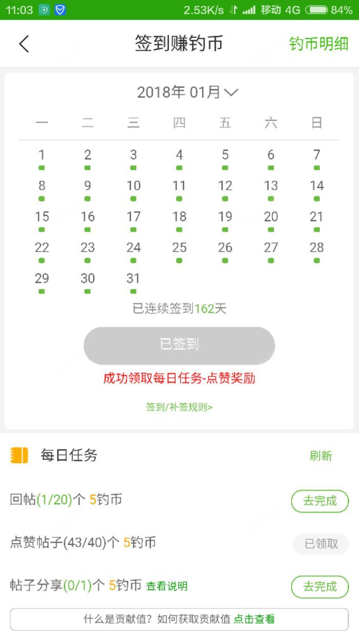 [i=s] 本帖最后由 台州新手学钓鱼 于 2018-1-31 16:55 编辑 [/i] 接触好钓鱼已有好几个月了,每天也就做的基本上相同的工作,签到,回复,点赞!