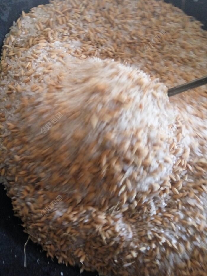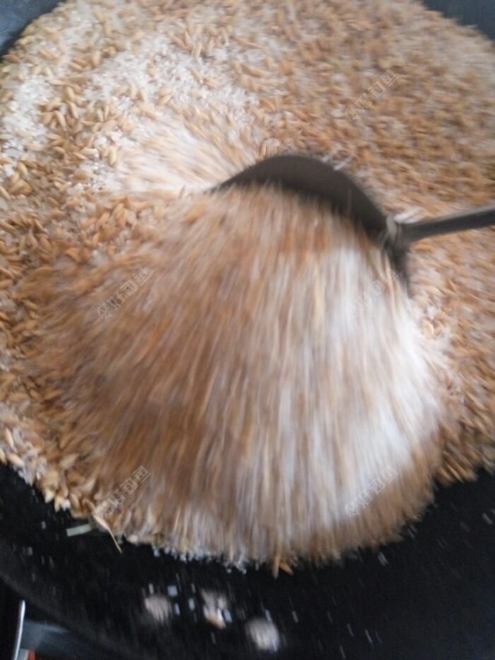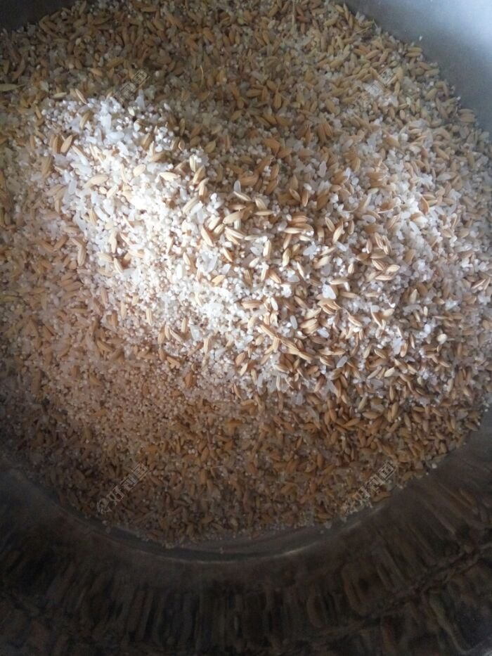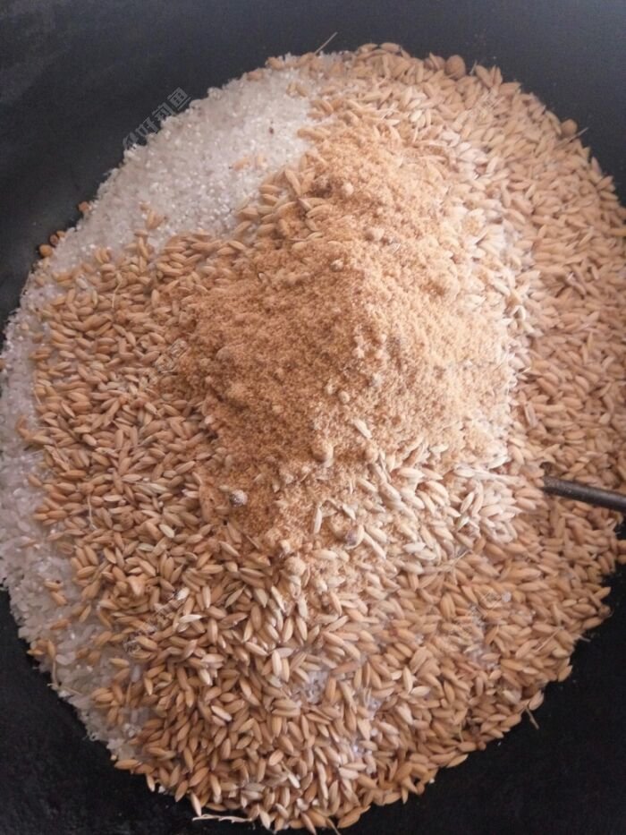 准备的材料有二斤小碎米,二斤稻谷,一斤大米,以前做酒米从不炒的,不过大神们都说炒香好,我也来炒一炒! 材料入窝,顺便加入红糖,食盐,味精,小火翻炒!