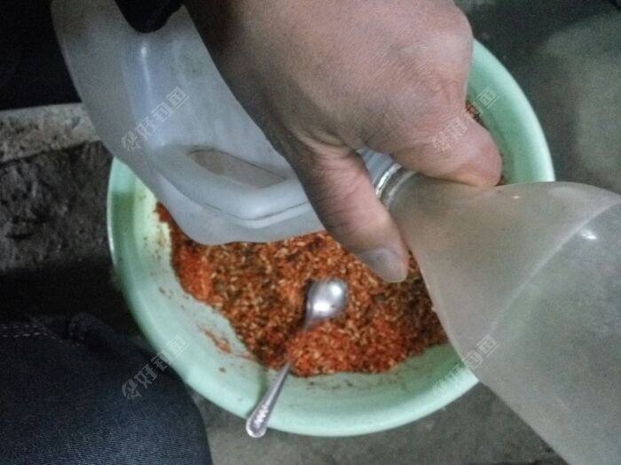 待添加剂加入后,再倒入高度白酒半斤左右,我是分两次倒的,先倒入一部分酒充分搅拌,再倒入稍热的米中,这时你会发现添加剂还有残留,将剩下的白酒倒入稍微搅一下倒入米中,基本上就不浪费液体了!