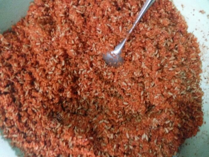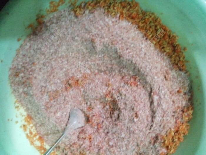 搅拌好后,再加入菜籽饼搅拌,好了,大功告成,闻着味挺香的!接下来就是装瓶储藏工作了!