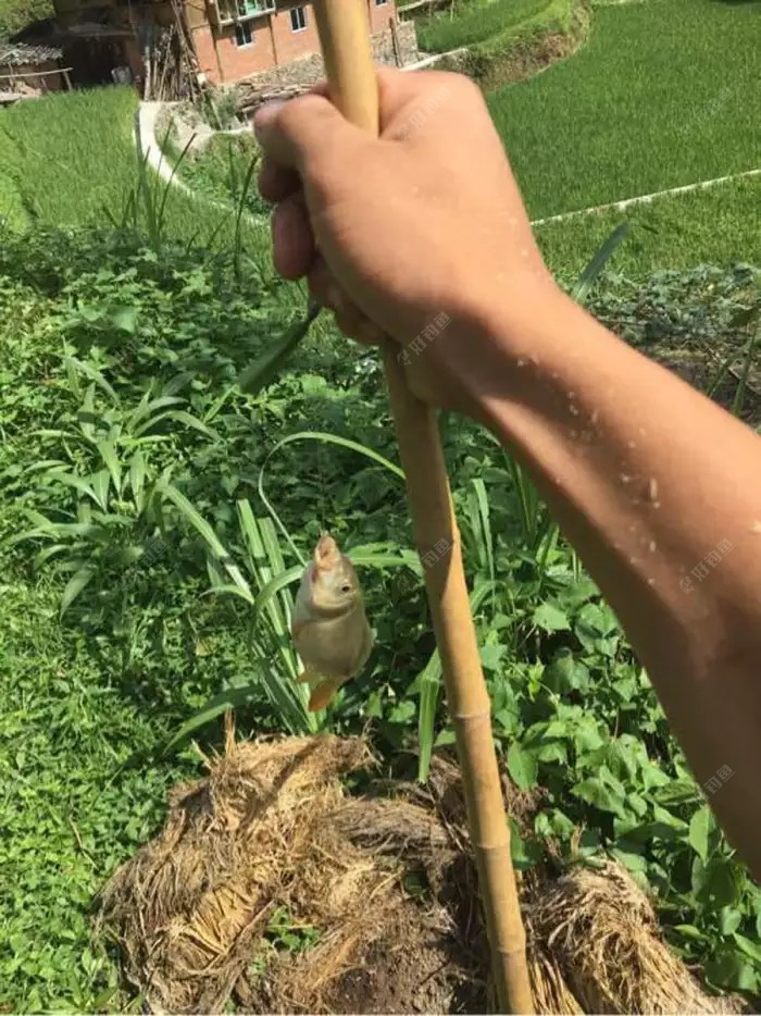 钓具也很简单,竹竿,齐竿线,不用钩子,另一头系上用一种叫“狗屎田鸡”的小田鸡腿。然后在稻田里离地5公分左右,抖啊抖的模拟虫子在动。手里觉得有分量时稻花鱼就上钩了。