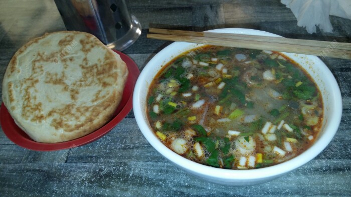 我沿河线走了一圈,没几个人都说,不好钓,钓友都说没鱼了,只能拉拉白条。我的心拔凉拔凉,这时候看到河边新开了一家羊肉汤,进去尝尝,5元的是杂碎,8元起步是肉,10元送饼丝一份。来一碗10的吧。