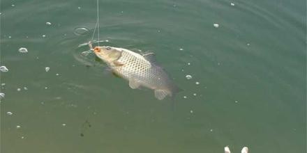 海竿甩钩钓应选择亮水,深水区的边缘地带。鲤鱼会经过这里到浅水区找螺蛳或干脆就在这一区域寻觅螺蛳。从鲤鱼一路拱泥翻泡可清楚观察到它的行踪。按我们当地渔民的说法,这正是鲤鱼的狡猾之处,一旦遇到危险可迅速窜到深水中躲避。 投到鲤鱼认为比较安全的位置,这减少了鲤鱼的防范意识。如果周围有鲤鱼翻泡,不久海竿定能大弯。我在钓鲤鱼过程中多次遇到这一情况。 有经验的钓手从鲤鱼的泡可看出鲤鱼的大小,三四颗黄豆般的大小的泡,是一斤以上三斤以下的小鲤鱼;四五颗比黄豆略大的泡是五斤左右的鲤鱼;六七颗乃至更多更大如蚕豆般大的泡是八斤以上的大鲤鱼,泡的数量和泡的大小与鲤鱼大小成正比。根据鲤鱼这一特性,要找鲤鱼的活动规律和鱼道也并不太难。 垂钓中,有时竿尖会微微点动一下又恢复平静,这时应密切注意。往往是鲤鱼在作试探,我无法知道鲤鱼是用什么方法让竿尖有这种反映,但我敢肯定是鲤鱼在试探饵的可疑性。遇到这种情况就要密切注意竿的反映。最多十分钟竿身会点动或大弯。
