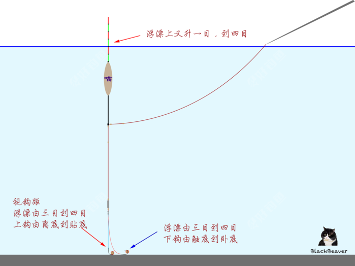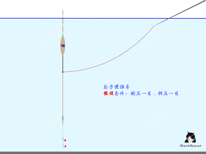 正经走起,从上图半水钓二目做起点。还是假设单钩压一目、单饵压一目,这样方便计算。好了,开撸……,往上,一点点撸……不要太快……直到…………浮漂变为三目