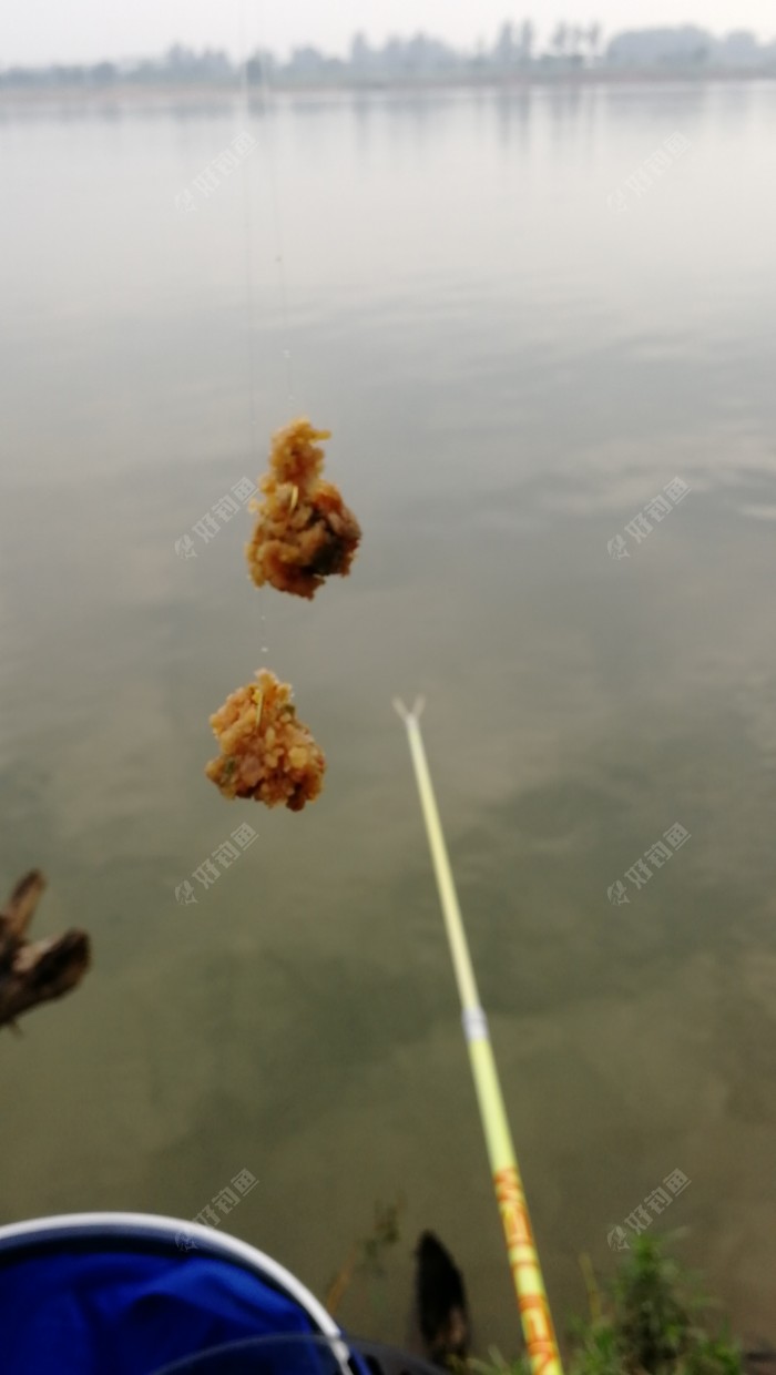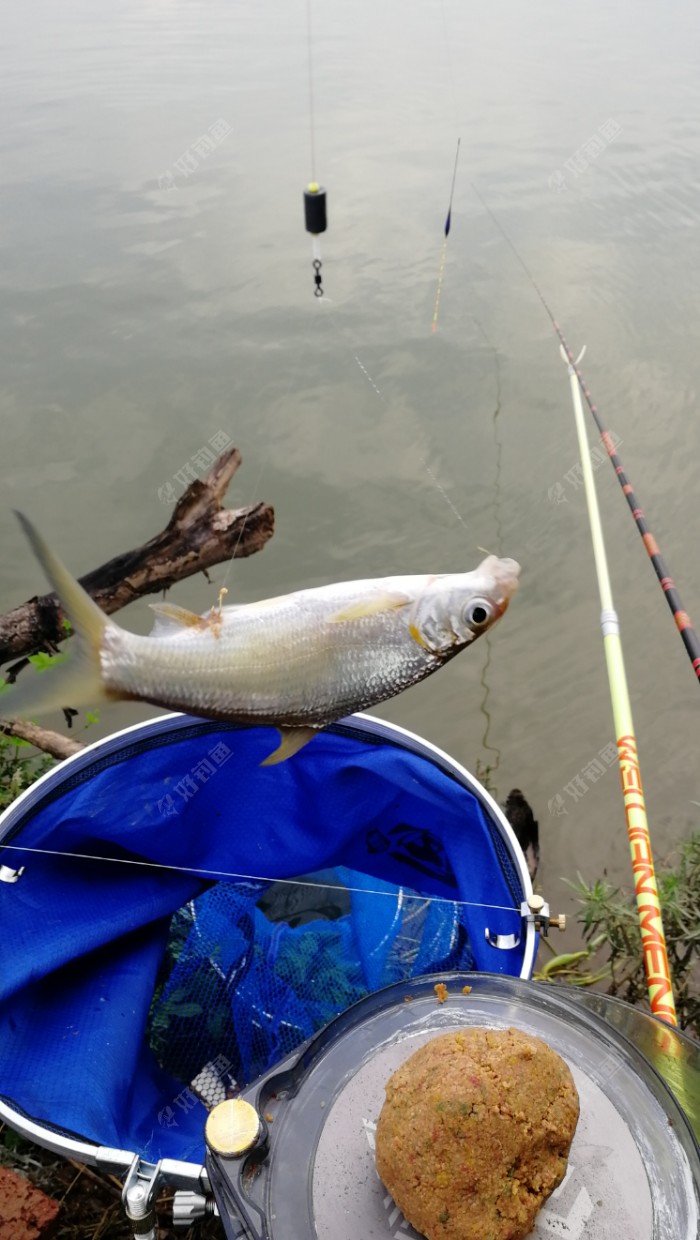 今天目标青尾鯝,准备好酒米、商品粉饵、颗粒加黄泥巴握成饼打窝,不带钩调1目,挂钩钓2、3目,钓小跑铅,一是能抗走水,二是青尾嘴巴朝下,钓顿等死口,用2号带刺海夕钩,子线0.4,20公分对折,第一竿就一个大顿口,提竿中鱼,鱼不大,力气还不小