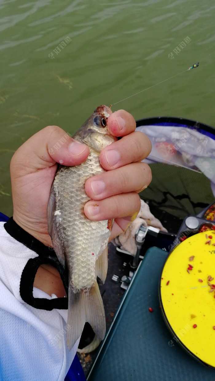 拉饵走起,大概过了半个小时,起了西南风,水面上的白条也越集越多,拉饵下不到底,上次饵料都钓的挺好的,今天怎么来了这么多餐条。实在没办法,采取B计划,钓小跑铅,子线缩短,饵料也重新开搓饵,2份大鲫终结者,一份超诱,一份螺鲤2号,半分金版九一八,饵水比0.9,拉丝粉占总饵料的十分之一,就能开出膨胀饵,饵料随便打粘,入水后会慢慢膨胀,方便鱼吸入。用B计划抛了几竿,浮漂有力的顿口,三指宽的土鲫鱼上钩,之后又钓了几条,可是好景不长,餐条越闹越凶,搓饵也下不去了。