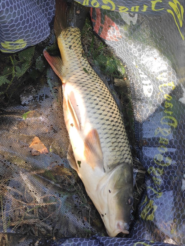 在没有发现鲤鱼泡泡的情况下,下杆40分钟,只见六米三的浮漂抖动了几下,接着就是一个顶漂,我起——哈哈——中鱼,不错的力道,第一个回合,鱼线刚刚发出破风之声,便被一个八字回鱼拉了回来,经过五、六个回合的有惊无险,便顺利地进入了新抄网,第一尾漂亮的目测2斤以上的鲤鱼,成功入护。