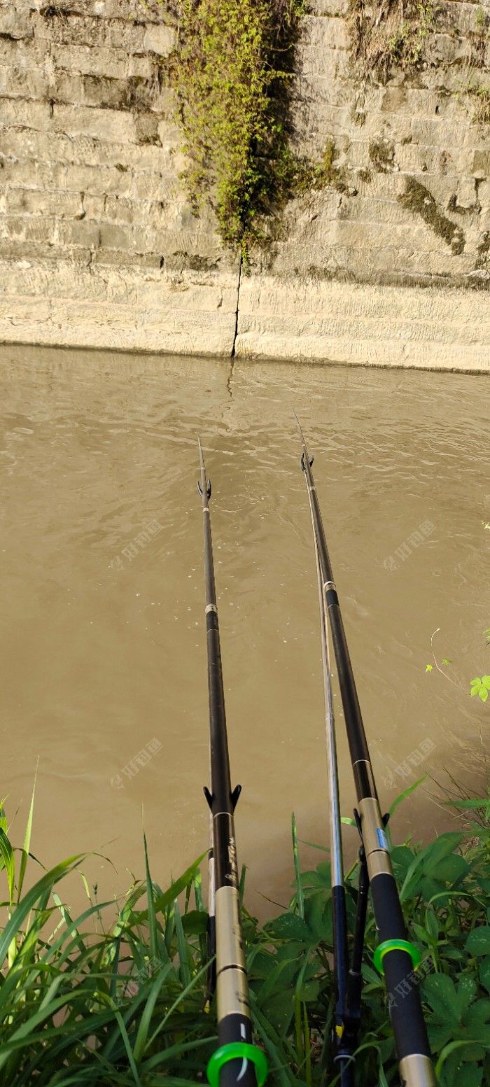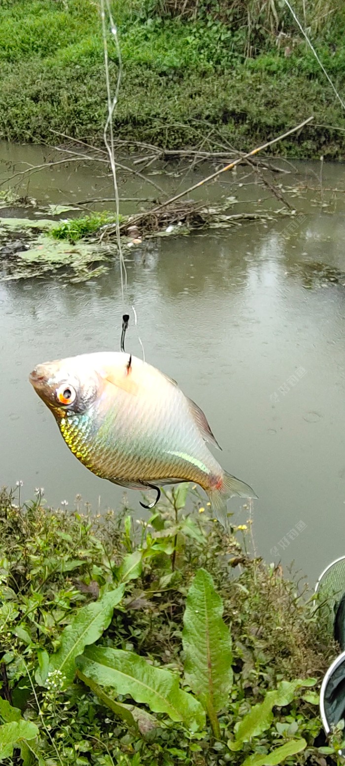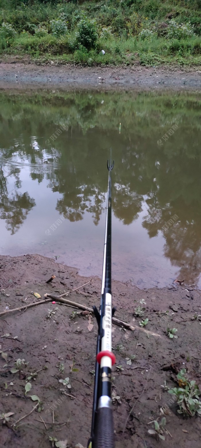 反正睡不着,六点半起床,雨还不小,不管那么多了还是准备出发,一根杆钓鲤鱼,一根杆钓鲫鱼,先选择水藻多的地方打窝,结果涨了水漂都离不起,换到小桥边回水湾,到12点就一条奶鲫,????不是空军。