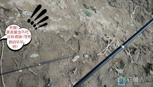 把这家伙弄上来着实让人兴奋,可俺高兴得过头咯,悲催的事还在后面哟,由于抄网把太短、抄鱼时就把线收的比竿还短,等弄上岸后把竿直插于地上、与抄网里的鱼在一直线上,俺正高兴地给他拍照,哪知它一个跳跃、只听头顶“啪”的一声,俺的矶竿哟,就这样被你给毁了。