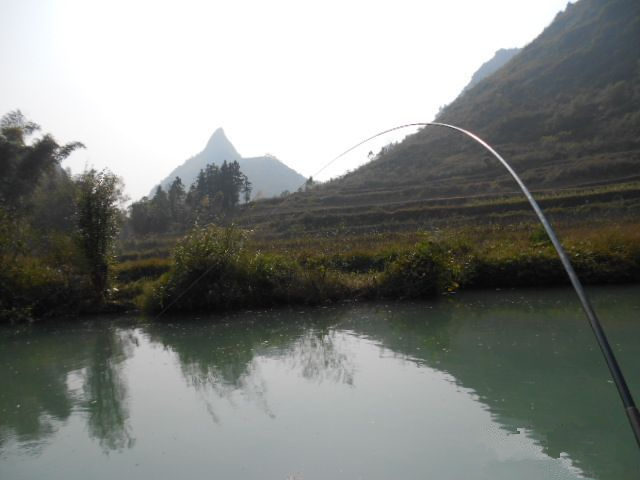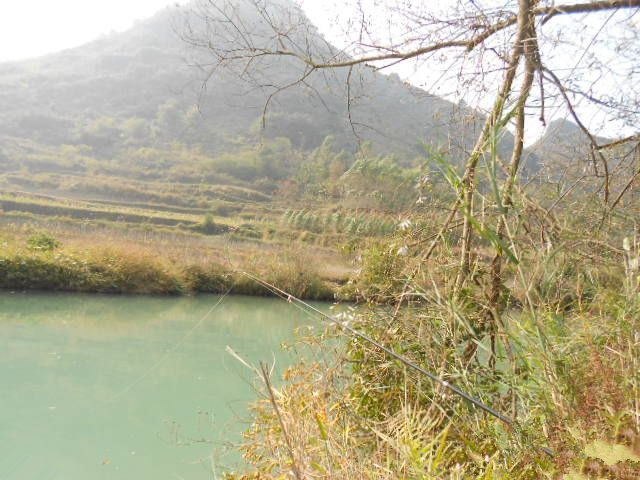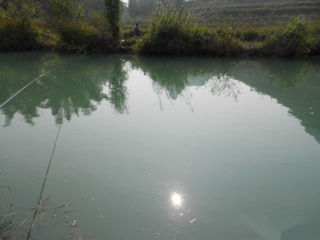 正在试饵料,却见一漂亮鱼儿跃出水面,不小,向着阳光,没有看清楚是什么鱼。顿时,心里狂喜,仿佛打了一针强心剂:鱼儿们是在欢迎咱呢。有鱼就好,有鱼就 好。因为是野河,线选粗些的,钩选大点的,万一挂点小底还可以拽上来。撒了点颗粒料和酒米作窝,不很多;搓几颗大点的饵,抛下去,也算作窝。