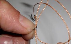 ③单套插头扣:用钓线折成圆圈,另一端在圆圈内通过一个圈成普通扣,再把手指伸入小圈,另一手拉紧两条线,最后把拴有死结的钧钧或金属环插入其中拉紧即成。