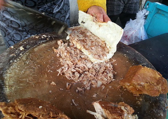 本想随便找个面店填饱肚子拉倒,没想到一阵浓烈的香气飘进车窗内。停车查看,却是路边摊上的陕西肉夹馍正散发着诱人的香味。红烧肉或瘦或肥剁碎,加以浓厚的汤汁一起夹进刚出炉的馍中,肉香四溢,口水不停的分泌而出。摸出十元人民币“老板!来两个。