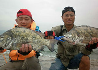 次日凌晨5点,天气变化较大,气温下降明显,风力加强了很多,钻出帐篷,浑身冷的打颤,已经开始准备潮涨了。恢复了体力继续作钓大马友,找了大概1个小时, 马友还是没见踪影,郁闷。经过讨论后,决定改钓黑鲷,这是我们的第二目标鱼,三人分别换上了12G、17.5G、28G的crank,按照对黑鲷的分析, 终于在7时半麦克先中了,正是目标鱼,将近5斤的黑鲷出水!接着小林中了石斑,开始了,我也中鱼了,又一条石斑,快找目标鱼!潮水正合适!流水稍有些急, 按分析要贴边找,略作调整后,3个人马上行动。好消息有了,我的竿子弯了下去,目标鱼找到,一条5斤的大黑鲷出水。之后3人连续中鱼,到9时半我们一共收 获了非目标鱼石斑10条,大黑鲷2条。这次没找到马友,略有遗憾,但黑鲷还是有。