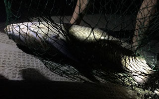 饵料是蓝鲫加纯谷物, 其中有两人帮忙,一个拿手电筒,一个拿网,用时半小时左右。按说用手电真的不是好选择,鱼出水见光会有一个比较大的反应。