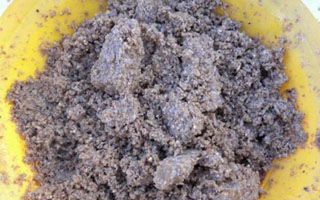 新鲜碎豆饼500克,上锅慢火反复煎妙,达到由黄色变成酱紫色,闻着浓香即可,切记不能妙糊,出锅晾凉、装袋。然后,再将高粱米750克下锅煮成八分熟, 达到软硬适度,稍硬又软,这样煮出来的高粱米才有甜味,煮烂了就不甜了。将米汤倒出,用笊篱捞入水盆中,换清凉水浸泡5分钟后,捞出控干或晾干,装入稍硬 些的塑料袋内。到达钓点,确定钩位后,先抽竿调试水线,在2.5—3.5米之内为最佳,将妙好的豆饼倒入高粱米袋内,就地取水浸泡20—30分钟,就可以 投料入窝了。打窝20分钟后,便可发窝,水面水下就有异常表现,小鱼纷纷迅逃,大鱼抢食上下翻动,时有跳出水面的情景出现。