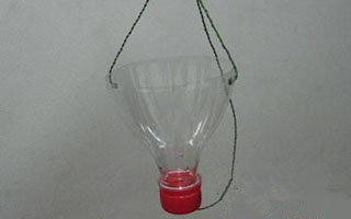 2、用锥子在塑料瓶底边缘处对称扎两眼,把铁丝安装上,两头钮死。