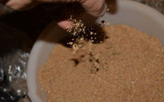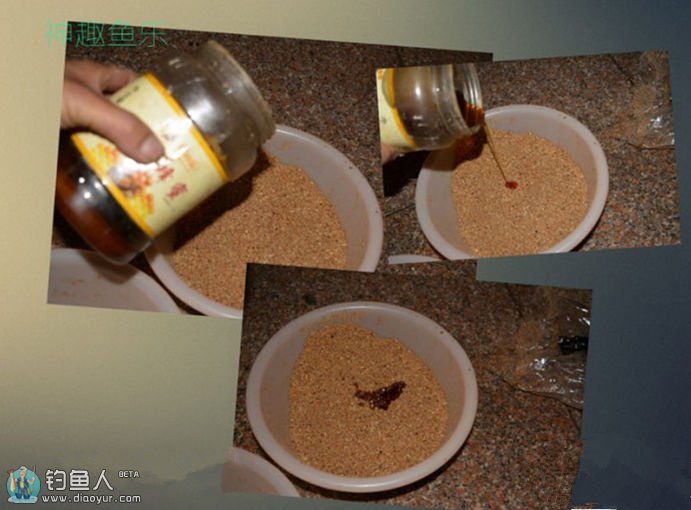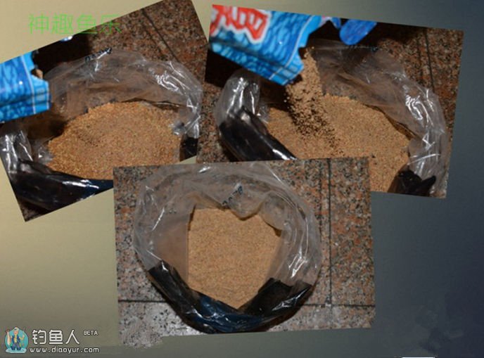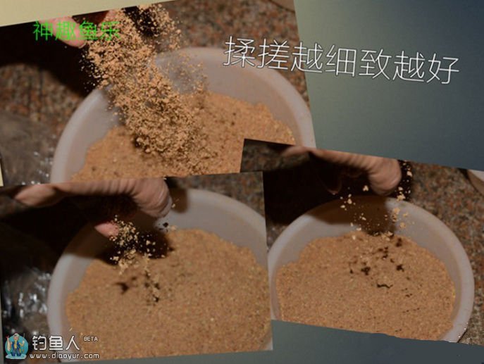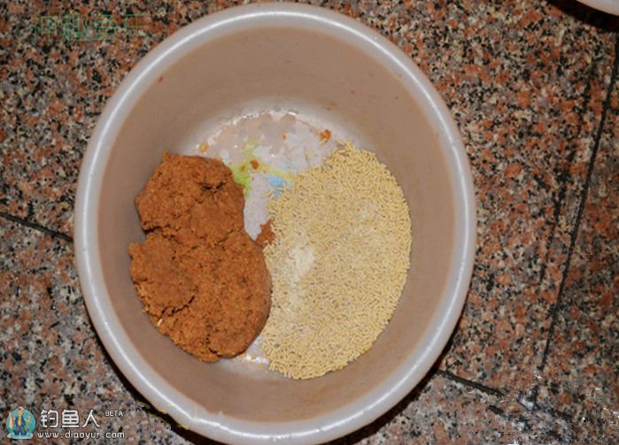 【步骤一】:先把收集回来的饵料全部揉合在一起,取一份等量的小鸡饲料,多点小鸡饲料也无关紧要【多点味道就轻点】。