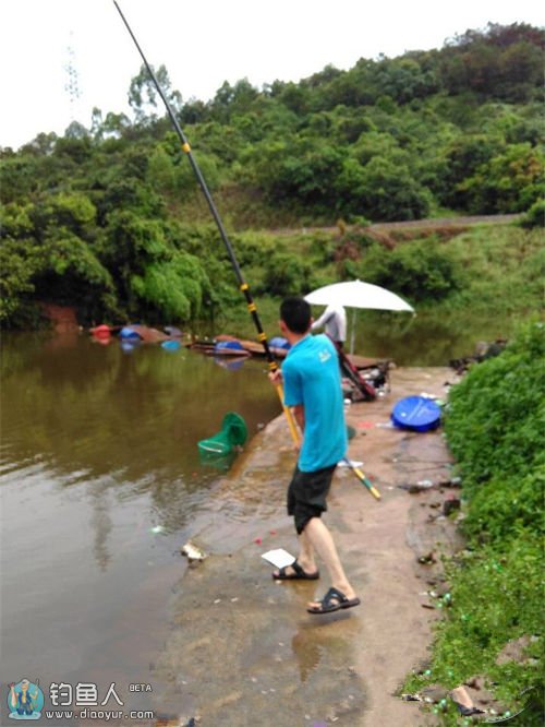 9点多到达惠环钓场,正在狂风暴雨中,几个先到的钓友已经开单了,钓友的热情高涨啊,风雨无阻,摇下车窗观察已有6个钓友在暴雨中作战,看到钓箱被吹到水里了哈哈哈,下车到休息处泡茶一起聊天,这么大暴雨也没法钓了,差不多还有一小时快到钟的时候雨渐渐小了,我忍不住了,和蔚蓝商议2人玩一只杆好了,我懒得搬装备,鱼货不要,我只要求过手隐就好,赶紧上车拿上最近一个月深圳研发试塘的钓黑小药+窝料+10斤脆螺就下去鱼塘了。