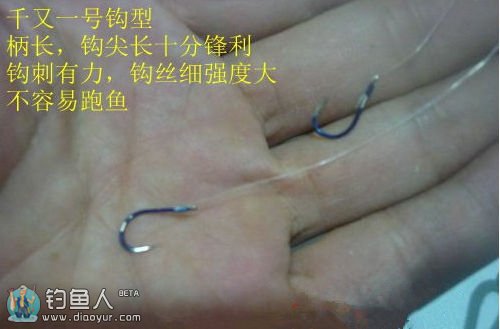 二、 钓组:钓线选择比较结实,切水性好的单股胶质线为好。大线一般在2.0号以上,子线在1.5号以上。鱼钩我一般选择千又一号至三号之间,这种钩子,钩柄长,钩尖长且锋利无比。钩柄长钩刺有力,加上钩尖长钩刺深不容易跑鱼。