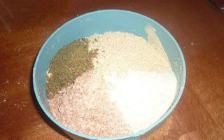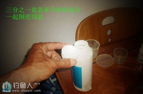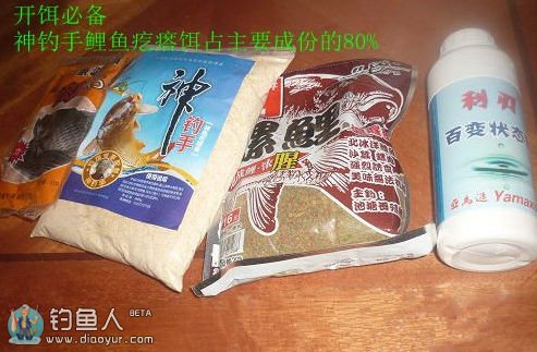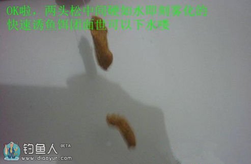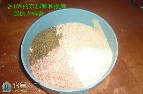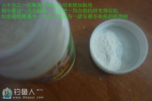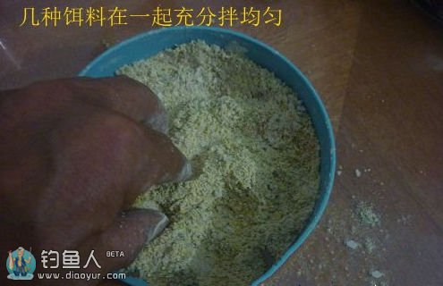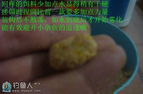 和前两种一样的配法,只不过多加一点点粘粉,就是我们胶粘米的那种沾分,量很小很小,小瓶盖子的10分之一足够了。这一款饵料不可和多,因为硬用着省,多了用不完的。况且是在前两种还要用的情况下客串。所以少和这种饵料。小杂鱼少的时候就不用和了。