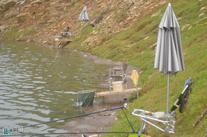 钓位一览!我的,小李的,詹哥的,李哥的早就收拾完被水淹了!饵盘已被牛给拱断了!
