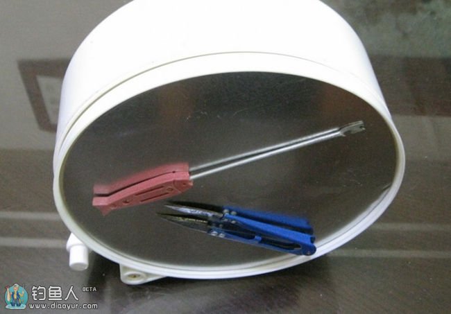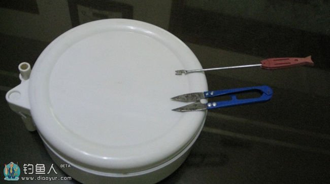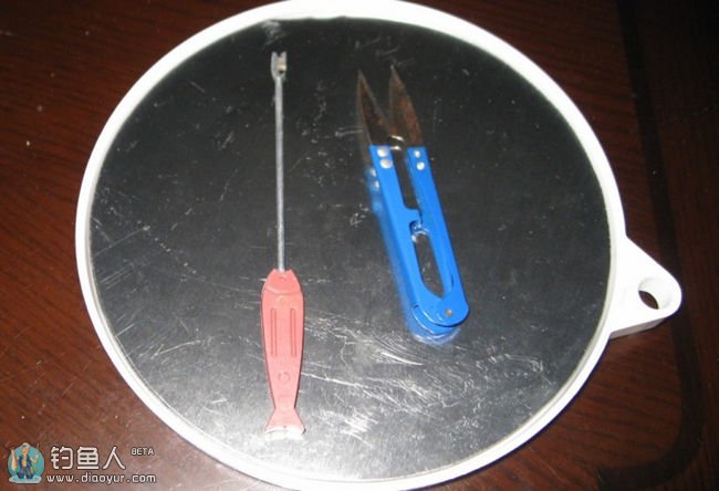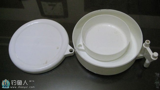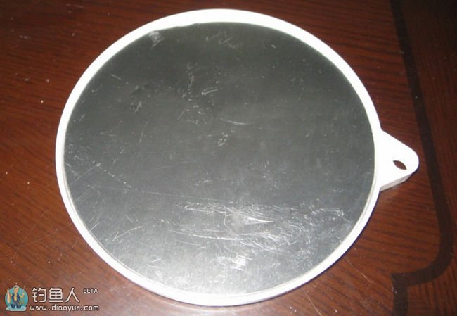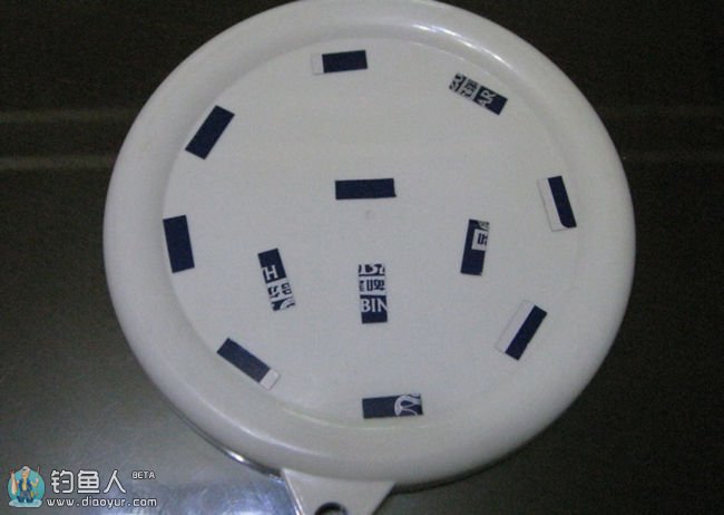 制作要点:502是瞬间粘合剂,饵料盘的布局要提前规划好,一旦粘合很难再做调整的,一般标准的饵料盘的内径是186mm,铁板要稍微大一点慢慢修剪正好才行,不然小了边上的缝隙就大,饵料会遗留在边上不好清洗。修剪好的铁板直接吸在磁铁上,千万不能用胶水粘牢,用完后有窍门是可以拿下来清洗的。有条件的朋友可以直接到铁匠铺里,花点钱叫师傅帮你剪一块圆的铁板就行。铁板厚度最好是在0.3mm左右不要超过0.5mm,太厚了分量就重,冬天冷转轴处容易开裂使用起来也不太方便。