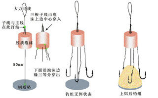 再将三根子线分别从泡沫上面的中心向下表面的边缘穿出,穿出点三等分下表面的圆周,将泡沫上边子线头和主线打死结固定,然后绑钩于泡沫下子线末端,要求泡沫下方子线30mm;将坠子固定于泡沫下方主线末端,要求坠子平放时距离钩底5—10mm,用502胶固定坠子和主线。胶干后既可以使用了