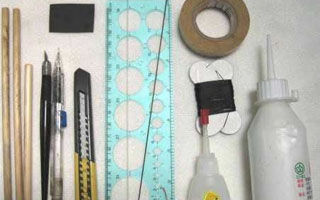 所以因陋就简...大家马上就能找到的工具我是有的,主要有:介纸刀(最好是碉刻刀),不干胶布(可以用电工绝缘胶布),铅笔美工笔,砂纸400目,800目,1200目,502胶水,乳胶,各种大小的胶圈(可用各种大小的胶管代替),当然还有最重要的:已风干的南荻杆...