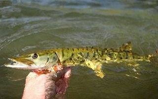 关 于饵的选择,虽说狗鱼不挑饵,但是同样的水域,同样的时间,有的人能上10多条鱼,有的人2-3条,而有的人空军,为什么呢?虽然狗鱼不挑口,但是也要选 对饵,狗鱼才有兴趣攻击。大多数人选择亮片这样的万能饵作为路亚狗鱼的首选,一来亮片便宜,挂地不心疼;二来确实也能路上狗鱼,所以在路亚狗鱼的10个人 中你能看到8个人都用的是亮片,还有两个人用的是复合亮片,狗鱼喜欢亮闪闪的颜色,不否认亮片确实能上狗鱼,尤其是胡须佬,它是狗鱼的最爱,虽然复合亮片 搜索狗鱼是绝对一流的,但是个人认为复合亮片上鱼容易脱钩,上鱼个体普遍不大,所以本人认为米诺才是玩狗鱼的首选。早、中、晚时段用不同深度的沉水米诺, 不同的收饵速度都会有意想不到的惊喜,米诺亮色系,带撞珠响动的风骚泳姿对狗鱼有着无限的诱惑力。大饵钓大鱼的规律也适用于狗鱼,所以个人很喜欢用米诺玩 狗鱼,基本上各个形态的硬饵都上过狗鱼。这个,大清早趁着口好,海游侠又立战功,擒获一条今年以来最大一尾狗鱼,重8.2斤,长80+cm。