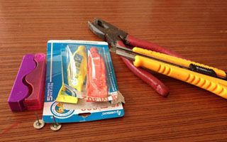 心动不如行动!!找来工具开始动手做起来,玩具废弃物,防盗磁扣针 、AB胶水、工具刀、钳子等。