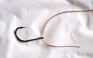 这个学习的也不用管它叫做什么结,总之,除了绑鱼钩之外,日后凡是遇到绑带环的配件,如转环等都是这个绑法,甚至将线帮到线轮上面也是这个绑法,方法是在要上线的轮子线杯上面绕两圈然后再打这个结就可以了,就是这么简单。步骤一:鱼线穿过鱼钩;