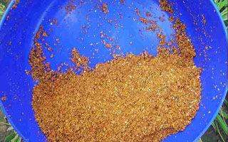 买一斤鱼饲料或者小鸡饲料用水化开。然后就给我上面说的那样做,就行。现在天冷了可以考虑一下加入小药和药酒什么的。钓草鱼和鲂鱼可以加入玉米香精。钓鲤鱼就加入鲤鱼精华和药酒。香精的多少根据你的饵料多少自己掌握。我给大家分享完了。大家可以试试