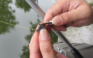 4、为了避免在扬竿过程中铅皮或加进去的铅皮块掉落,以及为了减小铅皮的水阻在调好浮漂后务必加固,收紧铅皮。