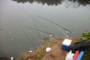 为使诱饵能够准确地落入选定的钓点之中,应在投饵之前就要在所选的每个钓点的岸边,用木棍或土块做一记号,并寻找对岸与之正对的方位物(山、石、草、树、电线杆或水中倒影均可),使记号、钓点与方位物者在一条直线上,同时用鱼竿测量出钓点与岸边的距离,并记住。