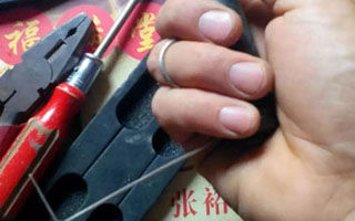 第二步:用螺丝刀把手做模具,把钢丝在上面绕出手指粗细的指环便于佩戴,并如图中所示用钳子早出S型延伸