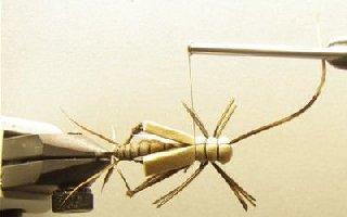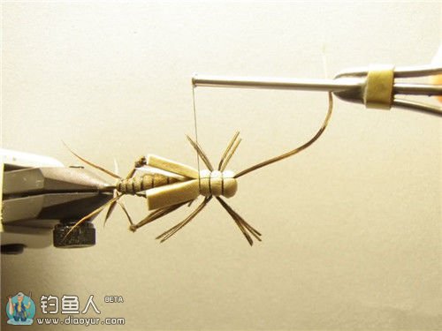 不论是若虫形态,或者是蛹态,都要在钩柄上缠上白颜色的一撮鸭子臀部的多脂绒毛,既能保证毛钩在水面之下 的正确姿势,又可起到观察的目的。