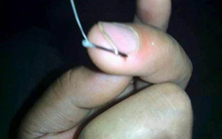 稍等片刻,手指的就会麻木,这时候你可以将鱼钩强行退出,如果钩的太深,倒钩刺比较大,无法退出,这是你不要着急,先点上一支烟,用比较锋利的小刀,或干净的剪刀用火把刀尖沙烧红从鱼钩入口处轻轻切一小口,鱼钩就会顺利的退出了。