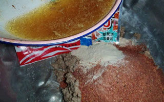 5.加入适量香虎香精,揉均。加香虎香精是为了提升鱼肉或鸡肝的鲜香味,入水后饵味的穿透力更强,使饵变得更适口。注意,直接接触香虎香精容易引起皮肤过敏(香虎手),此时要戴上手套来揉。成饵后香虎香精已经很分散了,直接用手上饵也没事。万一出现手痒的情况,要立即用肥皂清洗干净,并用俄罗纳英H软膏涂搽患处。