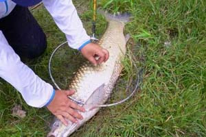 要看准鱼口在提竿,提竿易晚不宜早。当竿稍小幅度的颤动千万不要去提竿,要耐住性子等待,当竿身大弯或者突然回线再大力扬竿,扬竿后先摇两圈轮带紧浮线,将草鱼牵离开水底,防止挂到水底的障碍物。然后轻轻牵出窝点,将大草鱼控制在远处溜翻,这样的做法可以利用鱼线在水中的阻力加快溜鱼的速度,使草鱼加快疲乏。当大草鱼翻白无力后,再用抄网抄鱼入护。